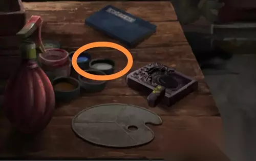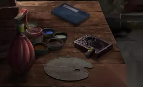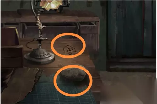来到工作室,拿取靠门边柜子上的刮刀,工作台的桌子上也有一个符号。
