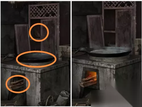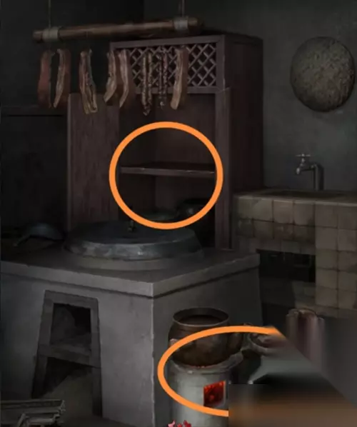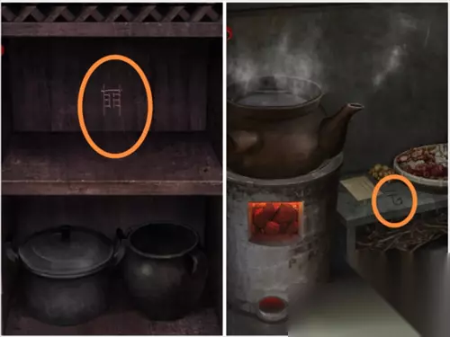 来到庭院进入厨房,在厨房柜子里和火炉旁边的凳子上分别有两个符号。