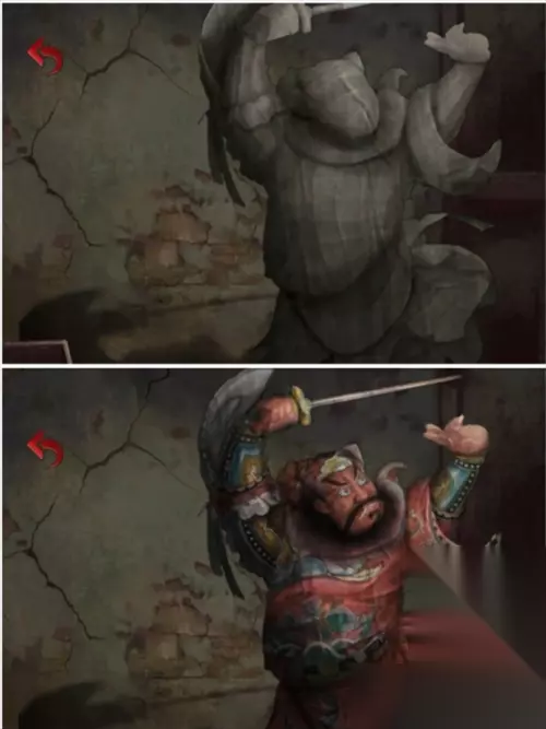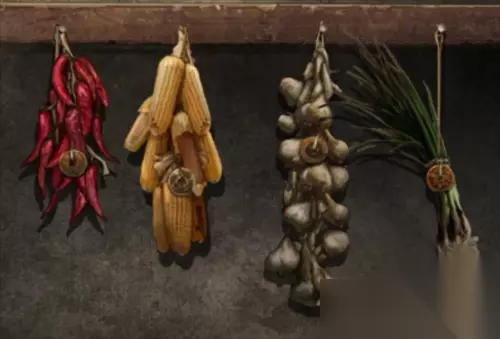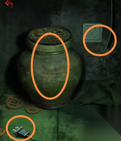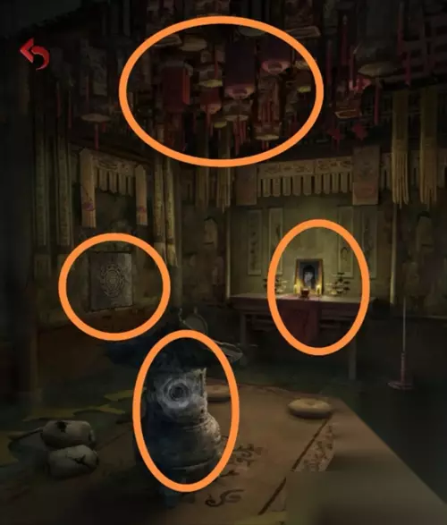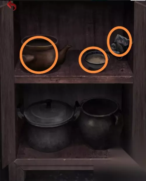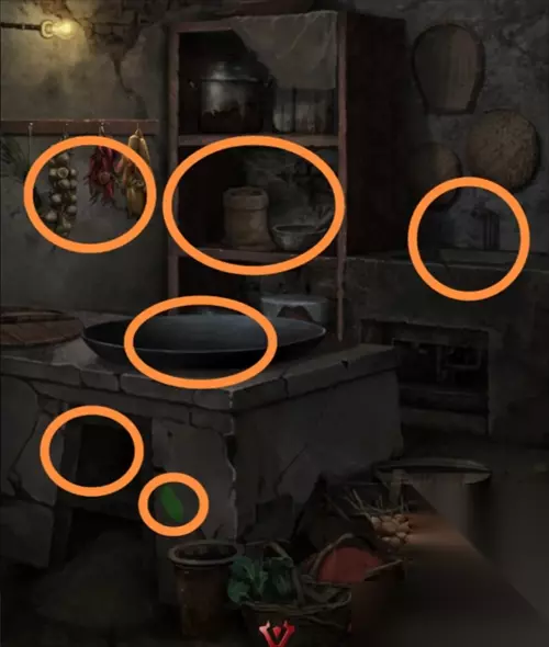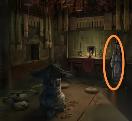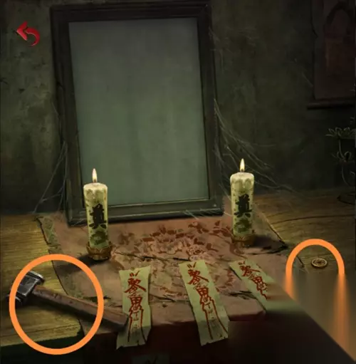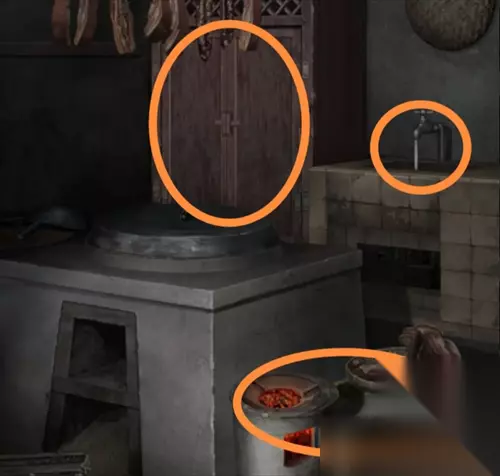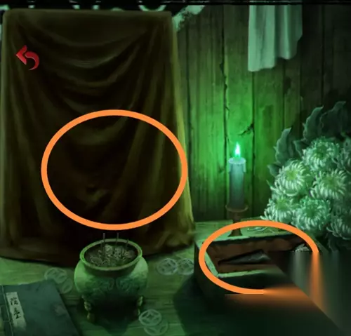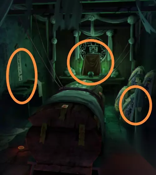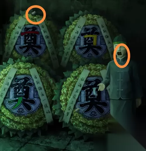 在灵堂花圈上获得一个白色头雕2,根据花圈的颜色笔画顺序红黄白绿调整厨房墙上的蔬菜位置,从左到右为辣椒、玉米、大蒜、大葱,得到一个辣椒。把辣椒给站在花圈旁的纸人,获得头雕1。
