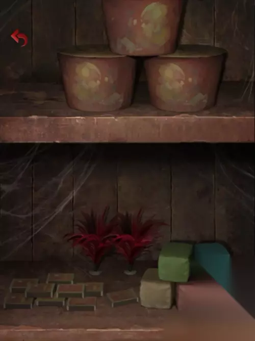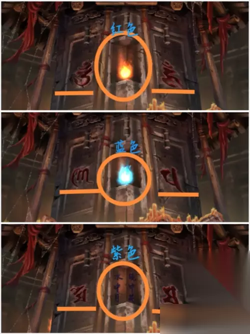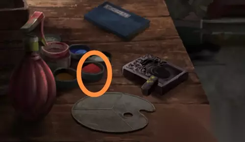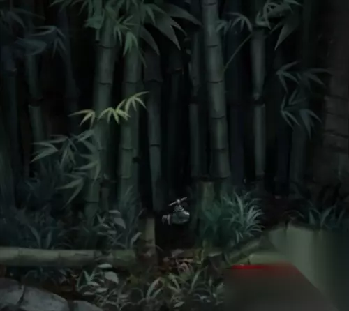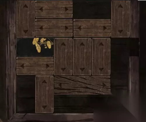 根据地图所有场景中遇到的各种颜色,木头桩上的蓝色、竹子堆旁的红色、灶台上的绿色、水池里的黄色、工作间烧东西火盆里的紫色,可得到工作间上锁的另一道门的密码(字是不变的,只需要改变字的颜色):紫蓝黄绿红。 进入里屋,桌子上的盒子通过华容道游戏得到墨块,拿走桌上的水瓢。