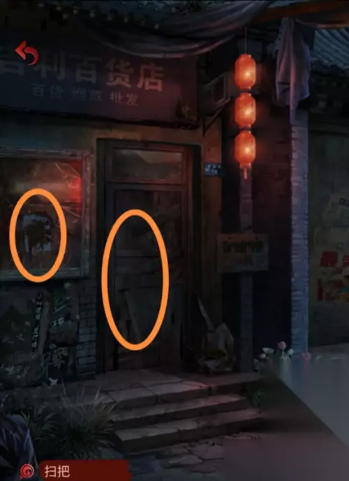 用扫帚将左面百货店告示上的信息扫清楚,获取信息,纸童旁边红灯笼表示指的方向是对的,绿灯笼表示方向是错的。