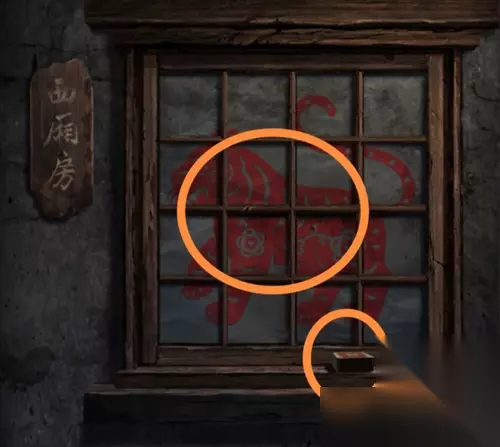 在工作室和房间中间的窗台上有火柴,旁边写着西厢房,窗子上有个红老虎。