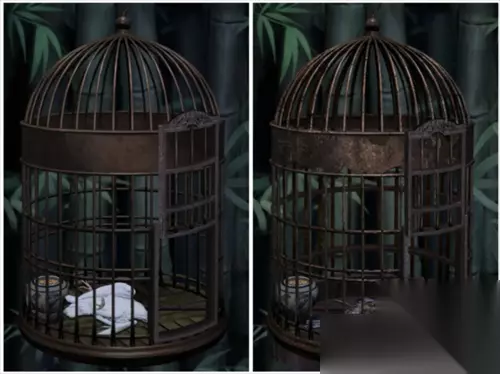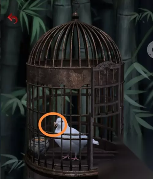回到绿意场景的鸟笼处,用钥匙打开鸟笼。鸟飞了出去,去到另一个场景的鸟笼处,用哨子将鸟叫回,拿到鸟嘴里的金属片。