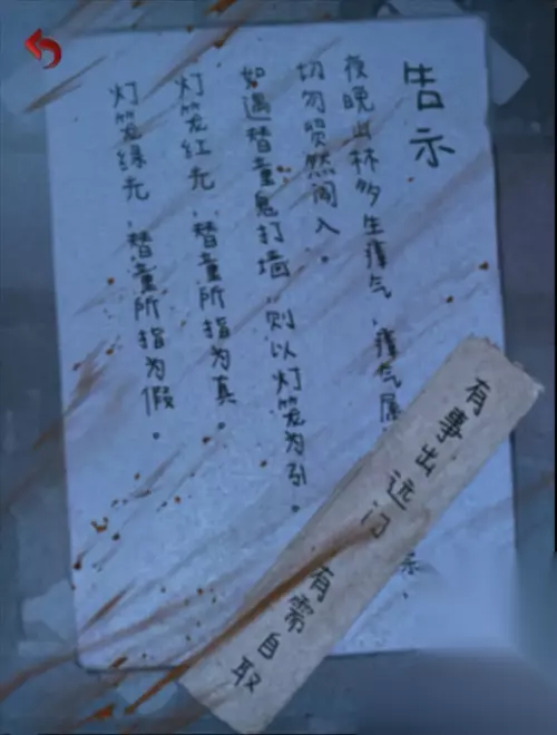 继续往弄堂里走,看见一个纸童,根据红绿灯笼来选择纸童手指的方向。 来到供桌,按子丑寅卯的时辰顺序点上面的灯笼,掉下来一根竹签。