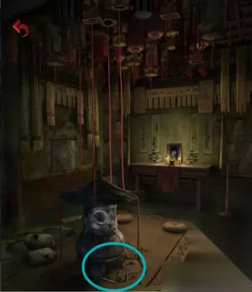 用剪刀剪掉走廊里被封印的门上的红线,用石头去打掉上面的三个八卦镜(玩小游戏)。