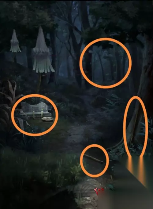 进入车旁边的黑色树林,拿取右边大树下的铁锹和地上的木棍。