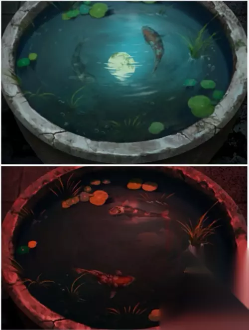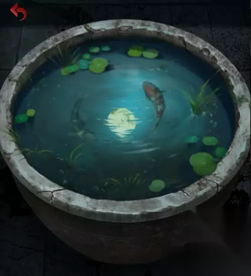 跟阿婆对话后,把阴阳玉佩交给她,换取一包鱼饲料,把鱼饲料撒进庭院里的大缸中,有月亮的影子映出来,用勺子去挖,获得黄珠子。