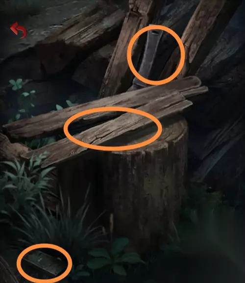 将白印章摁在柴火堆旁的板块上,得到木板,木板下面压着的是白色箭头。