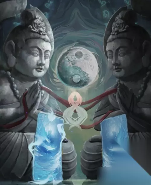 将童子像和燃烧的蜡烛放回到供桌正中间和左边缺失的位置上。