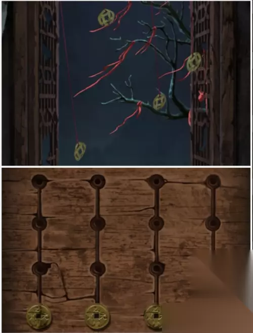 根据走廊窗户上的4个铜钱的上下位置,移动屋子里台阶上的铜钱盒子,打开盒子。