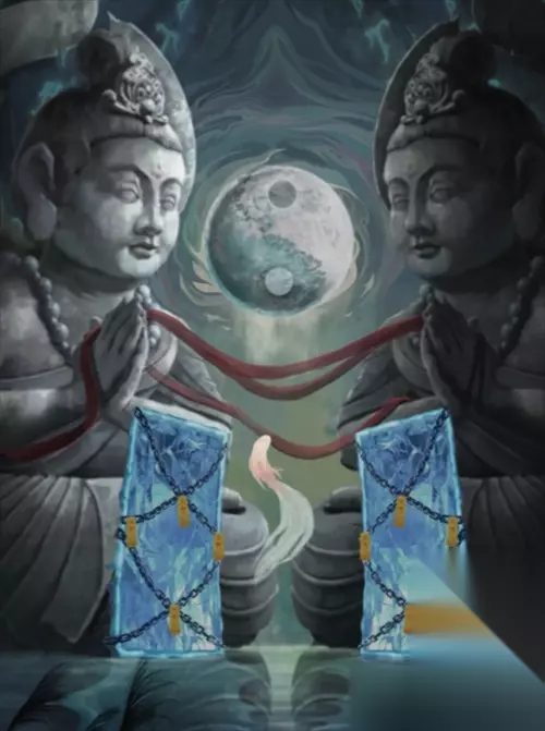 将三个头雕白色箭头和金属棍分别放入正中间桌子上的空盒里,得到降魔杵。用降魔杵点击被红布遮住的镜子,进入时司秘境。