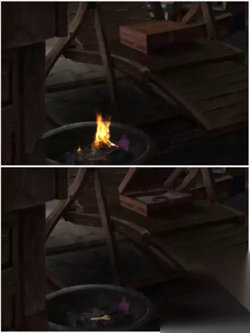 把金元宝放在烧东西的火盆里,用火柴点燃。得到一把钥匙,同时摇椅摇动,摇椅上的箱子自动打开,拿取里面的朱砂手串。