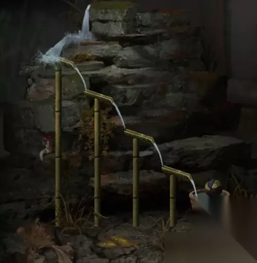 将庭院竹竿按下图位置摆好,水流留下,获得皮球。
