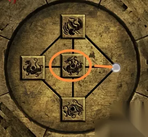 根据中间房间门两边的对联,东方青龙升,在玄武上,又通过之前窗户上西老虎的提示,可知上朱雀、下玄武、左老虎、右青龙,移动门上的图标。