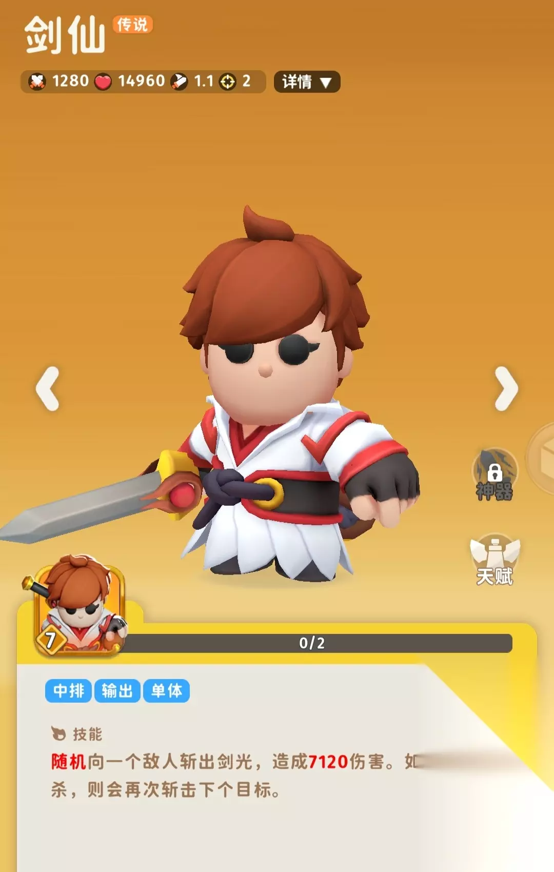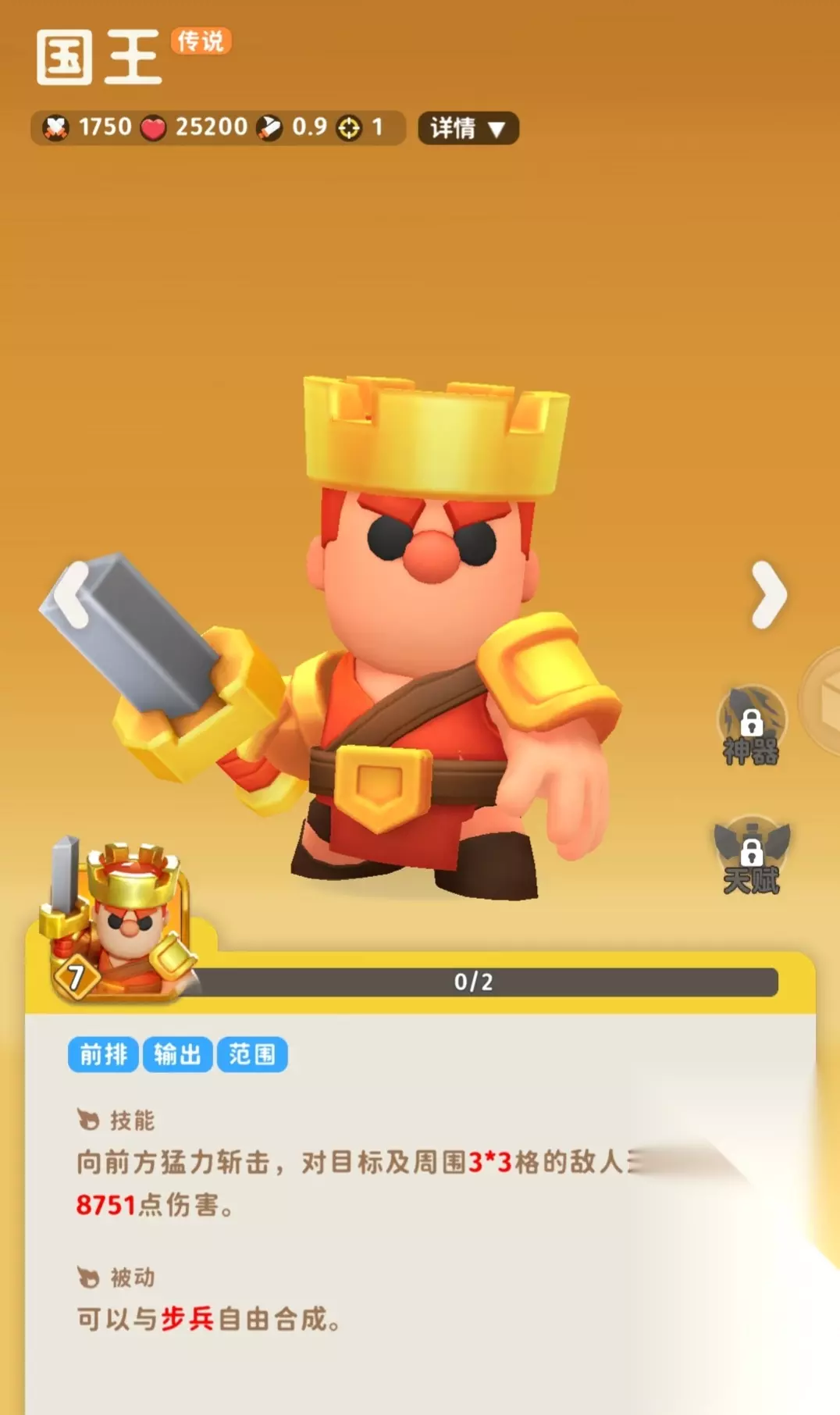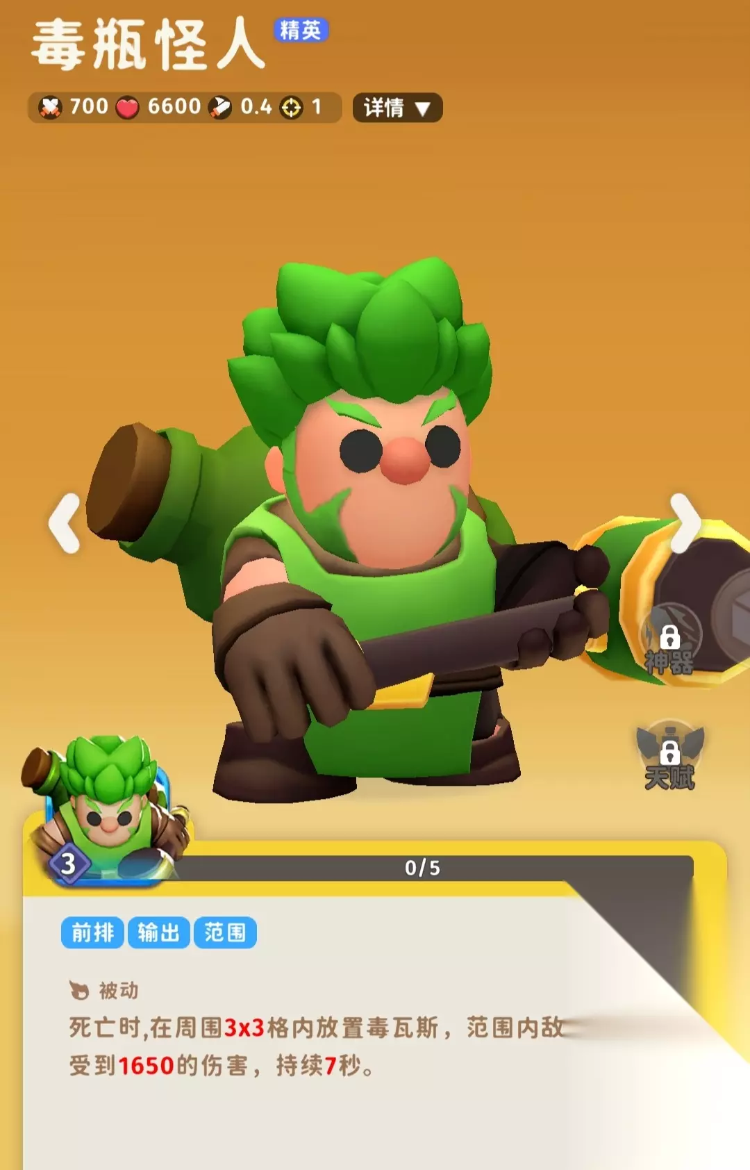 前方6格范围伤害,伤害还很不错,自身血量也不错,星数高了很难处理 新手7天送一个,然后远征第一个金卡就是他,强度可观,可以合步兵合成 注意,和步兵合成是随机结果,和神射能和射手合成剧毒能和哨兵合成同理,都是随机的。