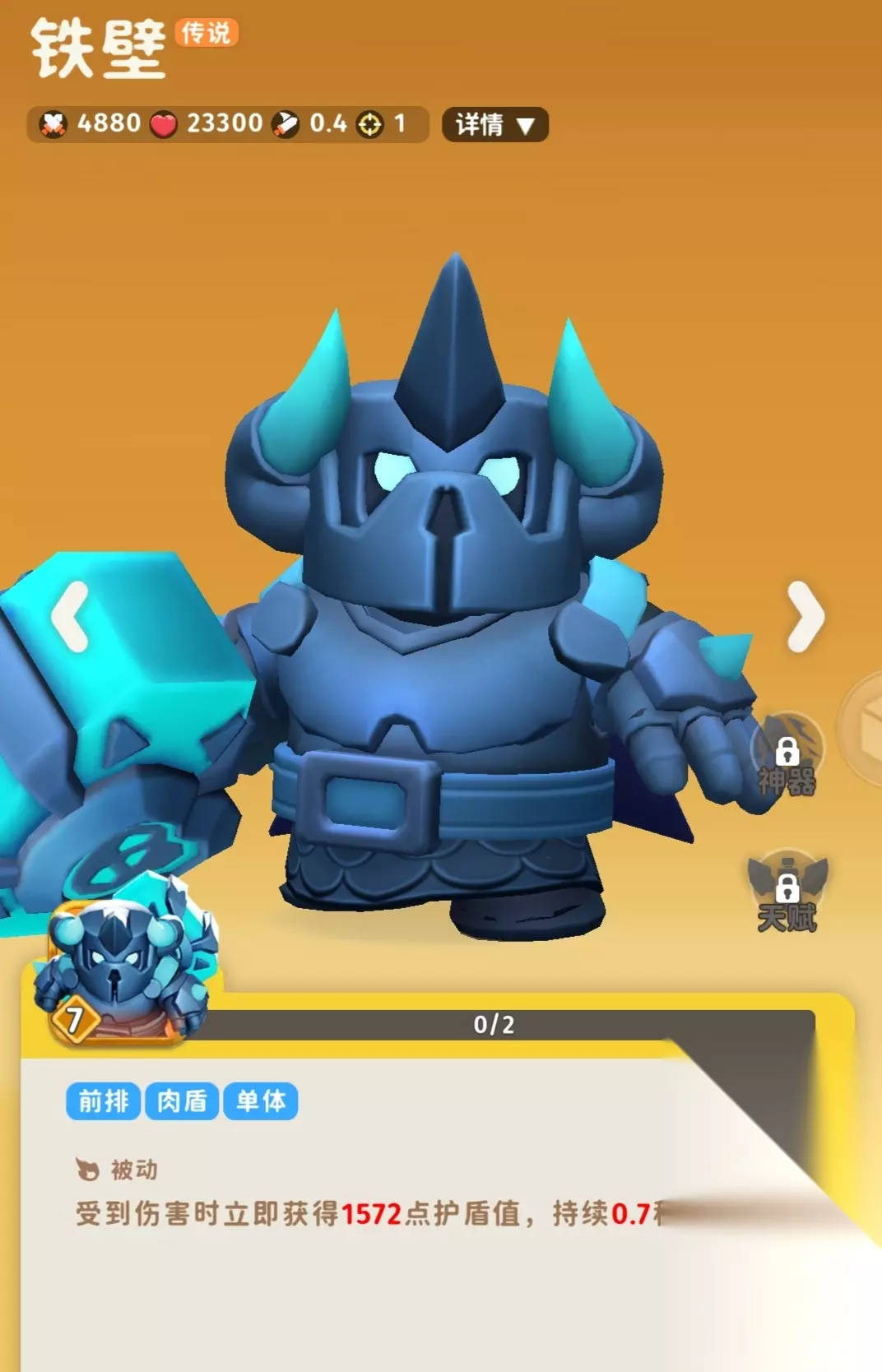 最肉的坦克,克制神射加特林等攻速快的角色,也适合伤害密集的环境。本身攻速慢但伤害可观 非常强力的坦克,我氪金就是神射+铁璧,又有伤害又肉,遇见有神射但没铁璧的玩家简直吊打(除非他神射天赋很高)