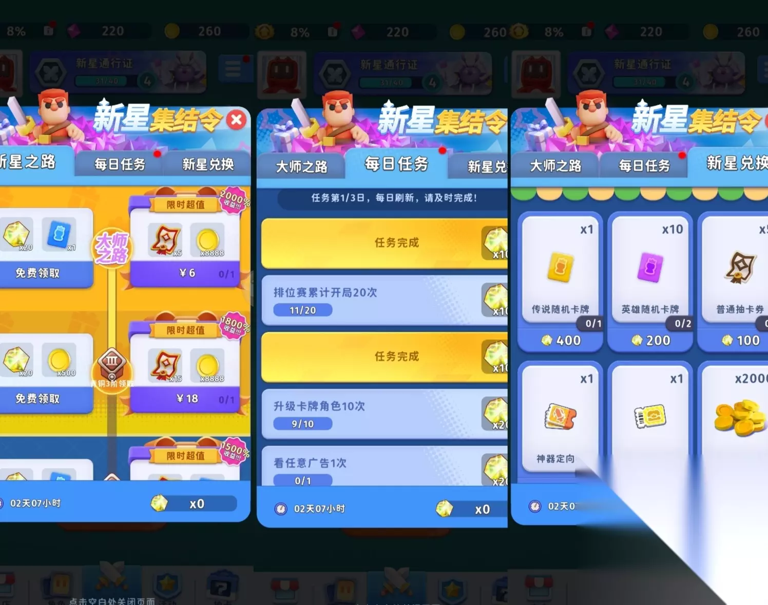 新手活动,结束后还会有这个活动。每日切记尽可能完成里面的任务,一共三天时间,可以换一个随机金卡 三、各种副本介绍 1.每周挑战