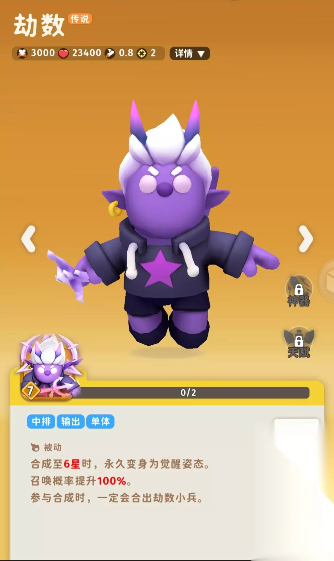最强角色,赌狗角色,合成6星后基本是稳赢了,没有合成6星前输出也很可观。 我认为是最强角色了,特别恶心,合成6星后基本无解,在6星前伤害也不低,而且也专属buff就是那个全局角色随机变成一种角色,到他这就全变劫数了,也可以带个百变小子加快合成。当然也不是天下无敌,还是有翻车的可能的。