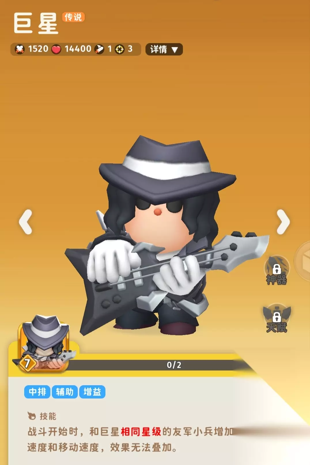 3200分解锁,初始160币。神器碎片以及升级用的三种材料的主要来源,需要高输出来打,怪不会反击。 这个副本用加特林特别好打,神射都比不上,加特林速度起来后很快就打完了,如果没有加特林可以用其他高输出比如神射等,神器定向券要谨慎用因为不多,尤其给神射这种强度高的c位。 大师赛和吃鸡模式就不介绍了,这俩个是这个游戏里真正的联机模式。 四、部分角色推荐 推荐几个我个人觉得比较强势的角色以及优缺点。 紫色角色