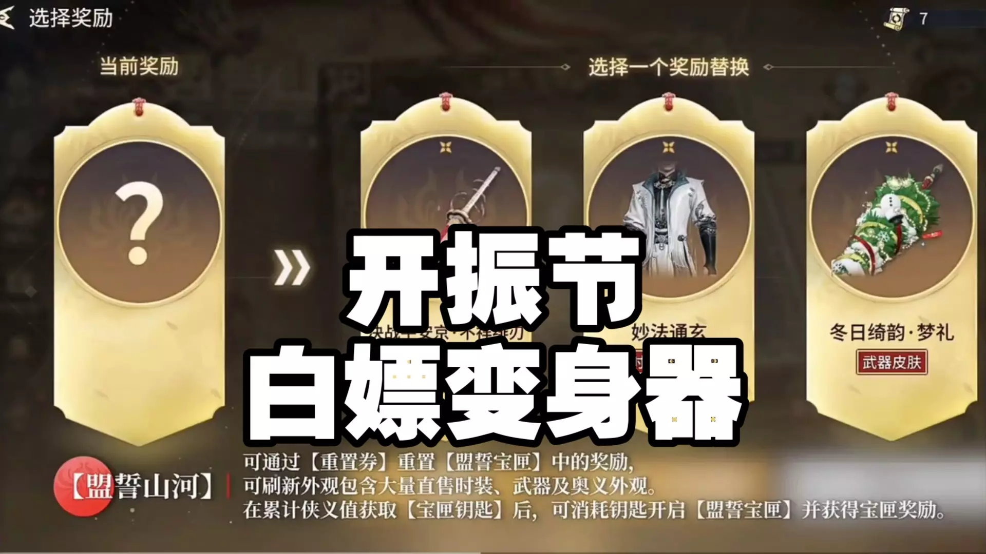 永劫无间手游开振节期间,使用重制卷重置盟誓山河活动的奖励,可刷出技能奥义、时装、武器皮肤等奖励,展示了用重制卷刷新奖励的过程与可获得的奖励类型。