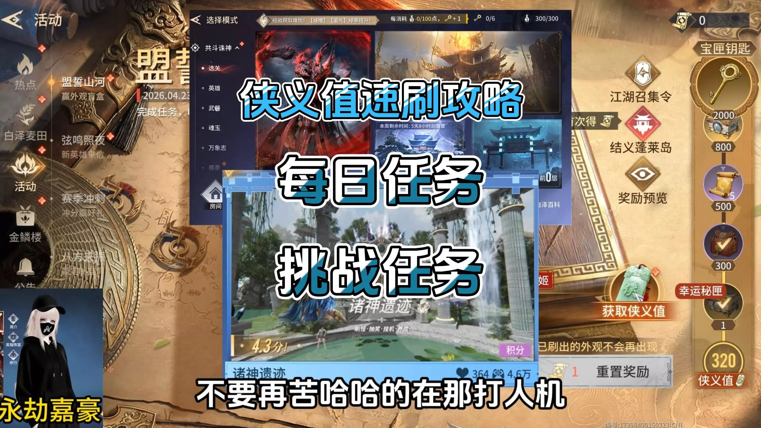 盟誓山河活动的奖励、弦鸣照夜速刷攻略、盟誓石台交互、任务完成地点、侠义值计算、刷新注意事项以及其他活动注意事项。