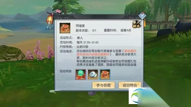 武林外传手游同福宴答题答案大全 活动时间: 每天21:30-21:45 参与条件: 加入帮会 活动规则 1.同福宴:活动开启后在帮会里会刷出几个酒桌,客官可以与酒桌进行交互,获取经验。 客官靠近酒桌,点击交互按钮可进入交互状态,点击解除交互按钮可脱离交互状态。 活动奖励 经验、银币、帮贡 温馨提示: 1、知识竞答活动在任意场景均可参加,在帮派属地参加则可以获得额外奖励; 2、当有玩家首先回答正确时,帮派属地内的正式帮众会获得银币奖励; 3、当有玩家首先答对问题后,其他玩家在限时内答对该题也将获得答题奖励; 4、同福宴期间,帮派内刷出的桌椅中,就座的正式帮众越多,则属地内正式帮众的经验获得也越多。