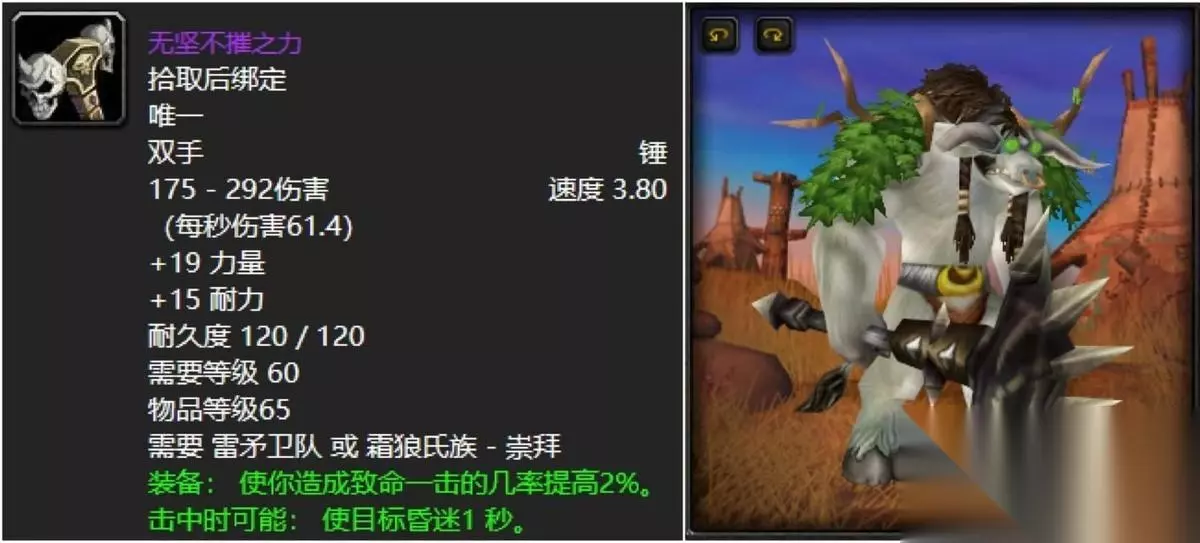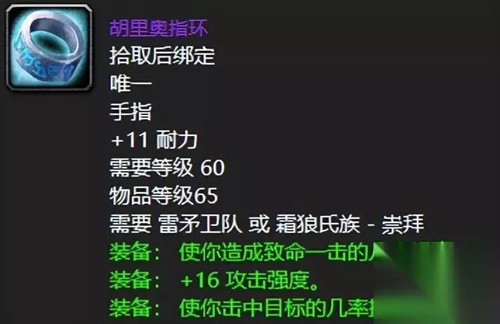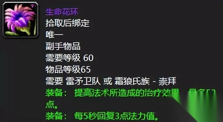 既然说到副手,那么必然要谈谈霜狼声望崇拜的生命花环,这丫的可以说无论牧师、萨满还是奶德,只要你声望够了,手上肯定是要拿着它的,毕竟53点的治疗效果搭配5回3点法力值的加持别提多给力了。 六:霜狼嗥叫者的号角