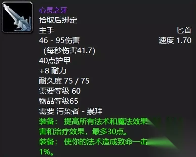 阿拉希污染者声望奖励的铁皮法杖,喵叔真的不曾拥有过,毕竟阿拉希这个战场,真的是打的心累,东奔西跑到处开旗别提多累人了,不过毕竟高端属性摆在那里,2%的致命一击搭配上不俗的41点法伤来说,拥有后完全可以无视统御法杖了。 二:心灵之牙