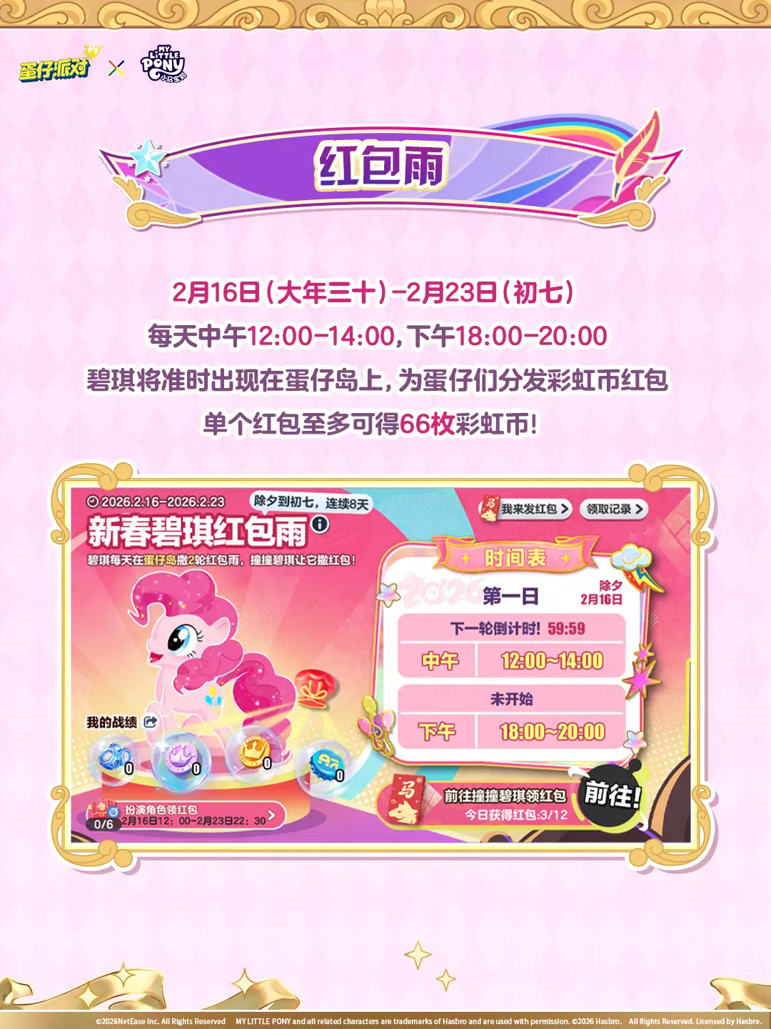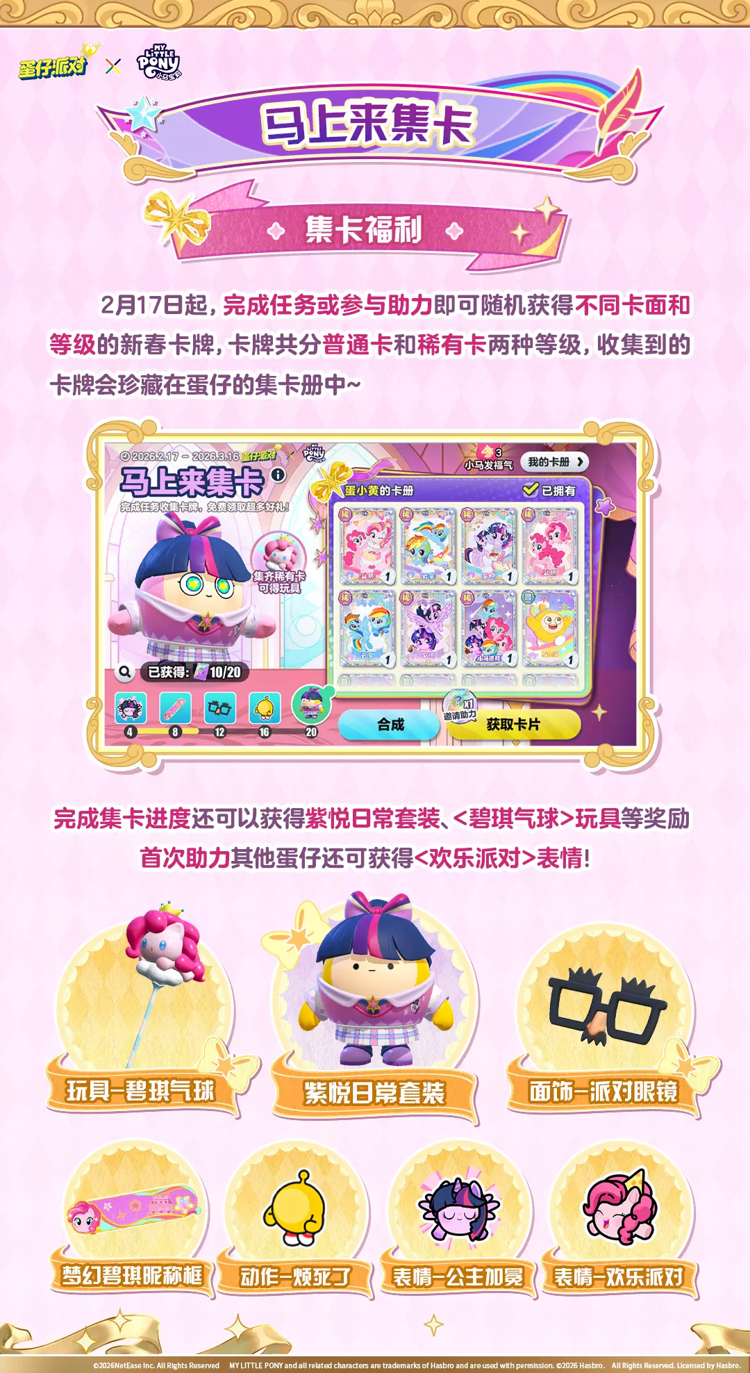 蛋仔派对开启《小马宝莉》联动福利活动,2月13日起开启小马宝莉蛋选卡预售,最低10蛋币开卡可享许愿币等福利;2月17日起还有集卡、发福气红包、新春红包雨等活动,可获取紫悦套装、彩虹币等奖励。