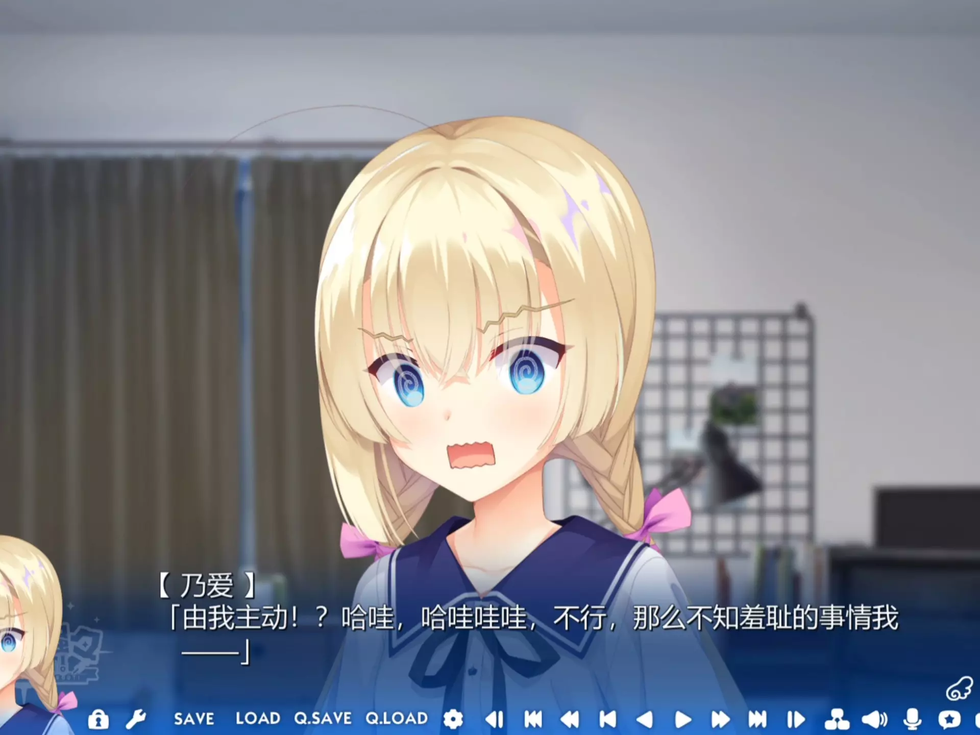 这是一组二次元游戏剧情截图,展示了角色乃爱与李空的亲密互动场景,乃爱对李空的举动表现出娇嗔,随后紫发角色由月出现,还配有吐槽李空的Q版漫画,呈现出趣味十足的恋爱向剧情。