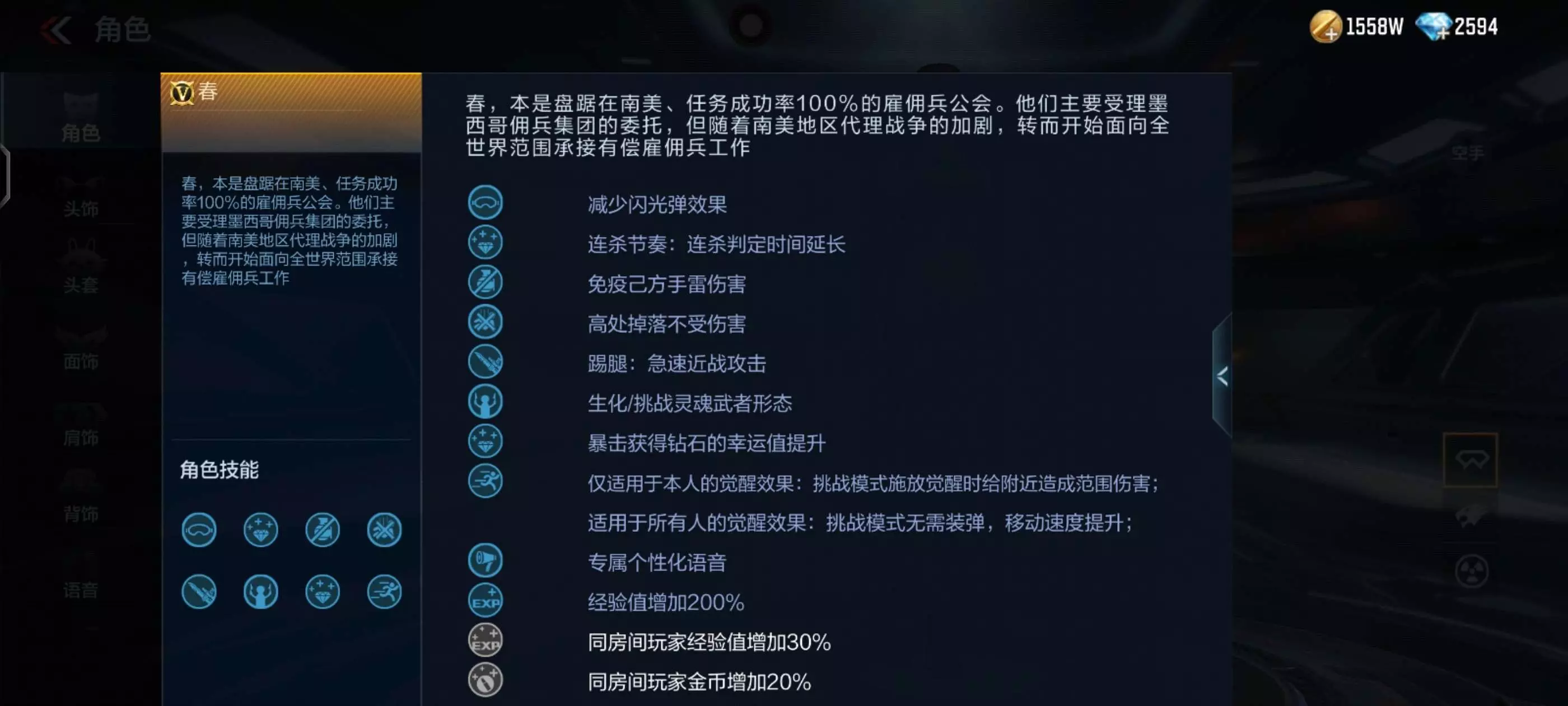 春:该角色为英雄级,有个适用于所有人的觉醒效果,在挑战中无需装弹,移动速度提升,移速提升也适用于跳跳乐,不过使用的同时,在场所有人也会得到提升。