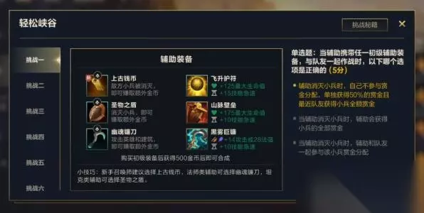 英雄联盟手游轻松峡谷答案 挑战一:当辅助携带任一初级辅助装备,与队友一起作战时,以下哪个选项是正确的(5分) 答案:辅助消灭小兵时,自己不参与赏金分配,单独获得50%的赏金且最靠近队友获得小兵全额赏金。