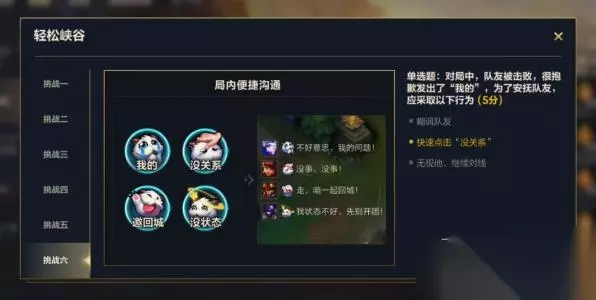 挑战六:对局中,队友被击败,很抱歉发出了“我的”,为了安抚队友,应来取以下行为(5分) 答案:快速点击“没关系”