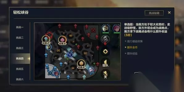 挑战二:对局挑战任务 挑战三:对局挑战任务 挑战四:当我方处于较大劣势时,史诗级野怪、敌方外塔会成为战路点,我方拿下战略点会有什么额外收益(5分) 答案:额外金币