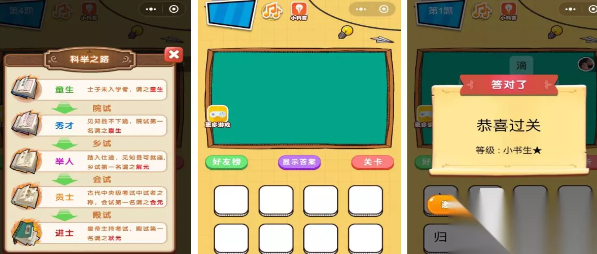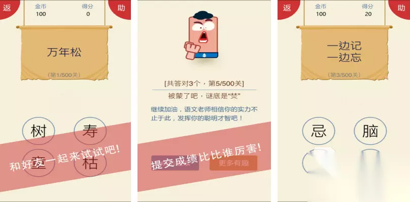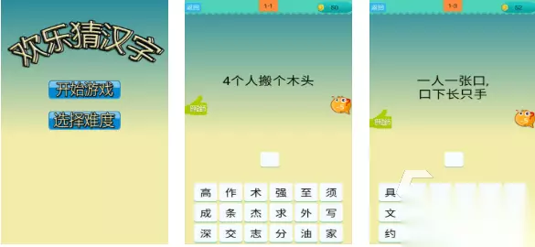 这是一款支持在线对战的竖屏汉字解谜游戏,内容轻量化但谜题数量庞大。玩家可通过破解谜题提升等级与官职,并获取虚拟俸禄奖励。游戏背景设定于古代文苑之中,充满浓厚的文化气息。独特的猜字机制带来持续不断的解谜快感,特殊题型设计甚至能让资深玩家感到棘手,极具挑战性。 高速下载 普通下载 8、《欢乐猜汉字》