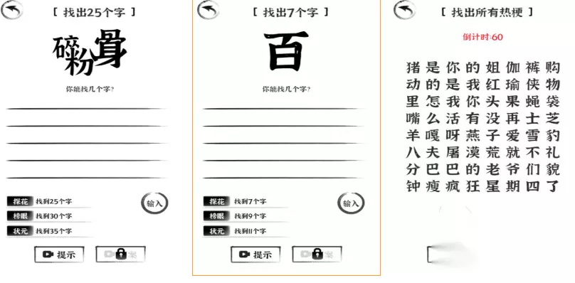 该游戏堪称汉字知识的综合百科,集成了猜字、找字、释义解读等多种创新玩法。整体界面采用黑白极简风格,类似纸质书籍的视觉感受增强了文化氛围。每个汉字都配有详细注解,便于理解其本义与演变过程。同时融入了不少网络流行语和热点梗,使解谜过程更富趣味性和时代感。解题节奏适中,适合边玩边学,逐步拓展汉字认知边界。 高速下载 普通下载 3、《欢乐猜字》
