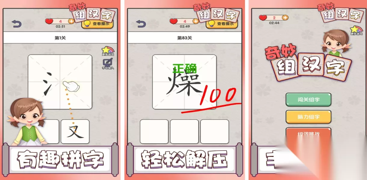 这款APP全面展现了汉字文化的精髓,涵盖移花接木、组合拆解等多种互动玩法,内容不重复且富有创意。大量关卡设计帮助玩家系统掌握汉字结构与用法。特别加入AR书写功能,让用户能够亲手“书写”汉字,增强感官体验。丰富的知识点呈现方式新颖独特,尤其受到青少年用户的喜爱。 高速下载 普通下载 优先233乐园APP下载 10、《奇妙组汉字》