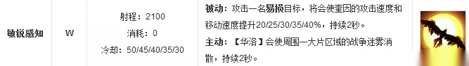W技能主动释放效果可以开放大范围视野,虽然时间不长,CD很长,但也可以帮助你在线上可以安稳的发育,及时发现对方的支援。这个技能备受争议,但我觉的它是神技,相比于其他英雄而言,类似寒冰的E技能,虽然侦察范围更远,但是释放需要瞄准,奎因的W技能就没有这个顾虑,奎因的W是一个瞬发技能,可以很快的开放自己周围很大块范围的视野,在追击敌人时,简直不能再爽了。 W还有一个被动效果,攻击易损目标后提升攻速与移速,这个技能弥补了奎因没有攻速的缺点,在对线中可以放肆地去消耗,不管是什么场合这个技能都能发挥它独特的威力。