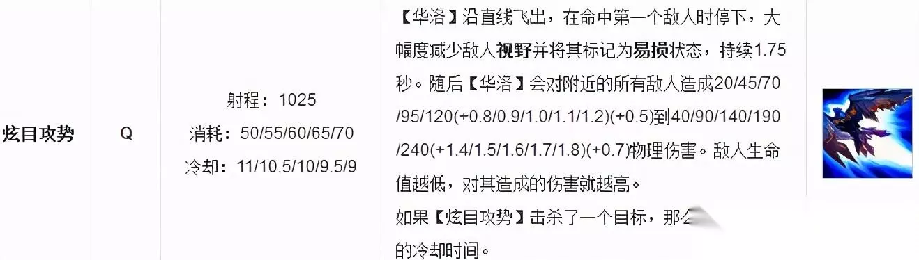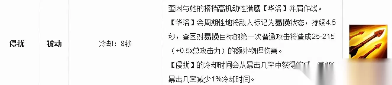 奎因的被动技能会在短暂时间内标记附近敌人,给敌人标记为易损状态持续4.5秒,之后奎因对易损状态的敌人第一次普攻会有伤害加成,且暴击几率越高被动触发的间隔时间越短。 这个技能是奎因的很重要技能,奎因的连招都是围绕着被动展开的,如果这次被动不触发,或者是技能未能命中没有触发被动,你这次的伤害会打很大折扣。(派大提醒大家:在对线时,优先攻击易损目标,可以提高你在线上的清线速度,以及poke强度,这样会让你的对手极为头疼。)