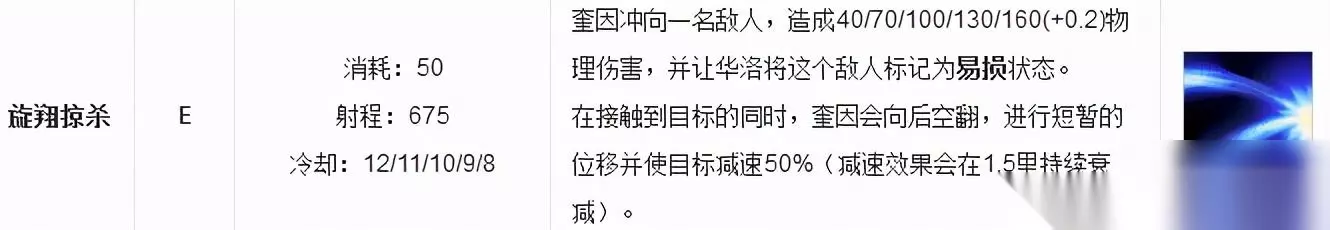 奎因的E技能带有小段位移,像是向前腾空踢一下再回到原地,对目标造成伤害并添加易损状态以及减速状态。派大告诉大家:E技能可以打断某些英雄的技能,这个记好了,利用E技能来追击敌人,控制敌人简直在舒服不过了。 在对线时,可以E技能起手然后衔接平A,再接Q技能衔接平A可以轻松的打出大量伤害,这个伤害可不可忽视,据我的经验,还没见过哪个英雄,在对线期可以抗的起奎因的两套完整技能组合消耗。