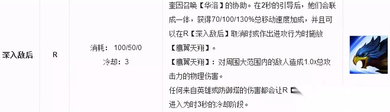 奎因的R技能也就是大招,可以让奎因变成一只鸟,获得大量的移速加成,他促使奎因成为了一个游走支援型刺客,为什么不说他是ADC呢,因为我举得把他放在下路有点太暴遣天物了,而且官方对他的定位也好像是战士,刺客什么的,我也记不清了。 奎因的大招,保证了奎因的支援,以及收割能力,但是其前期蓝耗是很严重的,如果你在6级的时候就使用两次,大招,那么你的蓝量估计也只够一套技能的释放了,但这丝毫不妨碍,奎因快乐起来,达到6级之后,你应该把重点放在支援上,在飞速清掉自己路兵线后,就立马去别的路去支援。
