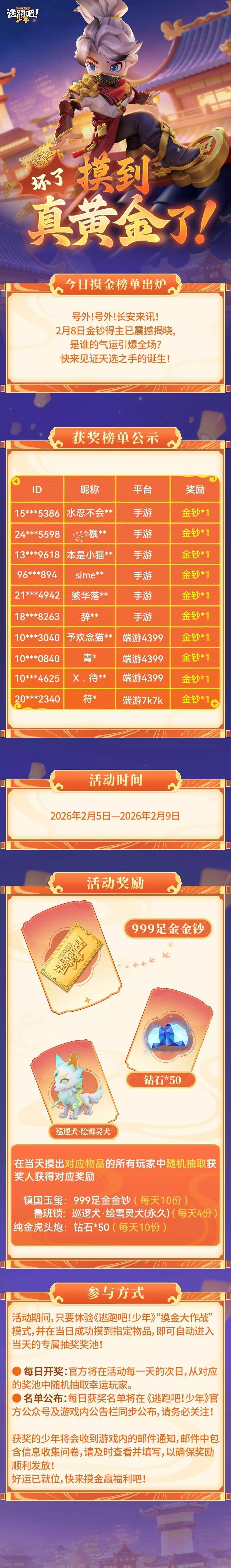 《逃跑吧!少年》“摸到真黄金”活动进入倒计时最后1天,现已公布2月8日金钞获奖名单,共10位玩家获得999足金金钞,活动还有钻石、限定宠物等奖励,玩家体验摸金大作战模式摸到指定物品即可参与抽奖。