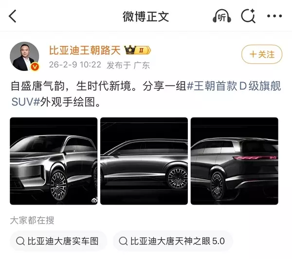 快科技2月9日消息,比亚迪王朝网销售事业部总经理路天在日前发布品牌首款D级旗舰SUV的外观手绘图,这款新车正是此前持续预热的“大唐”,其预计于2026年上半年正式上市,这也标志着比亚迪正式进军高端大型新能源SUV赛道。