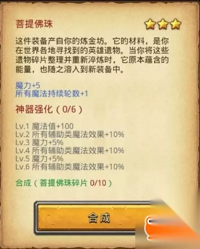 当你献祭满六件不同的装备以后,便可拿到一件特殊神器“菩提佛珠”