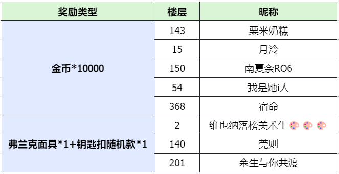 在符合规则的评论中,抽 5人送【金币*10000】,抽3人送【弗兰克面具*1+钥匙扣随机款*1】