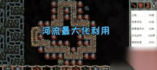 可以看到上图中攻速已达到204%,如果把图中的河流全换成灌木丛的话,攻速为120%,说明河流让灌木丛的利用率提高了近一倍。 原理很简单,河流对同一地块的效果可叠加,所以上图的森林和河流部分可简画,