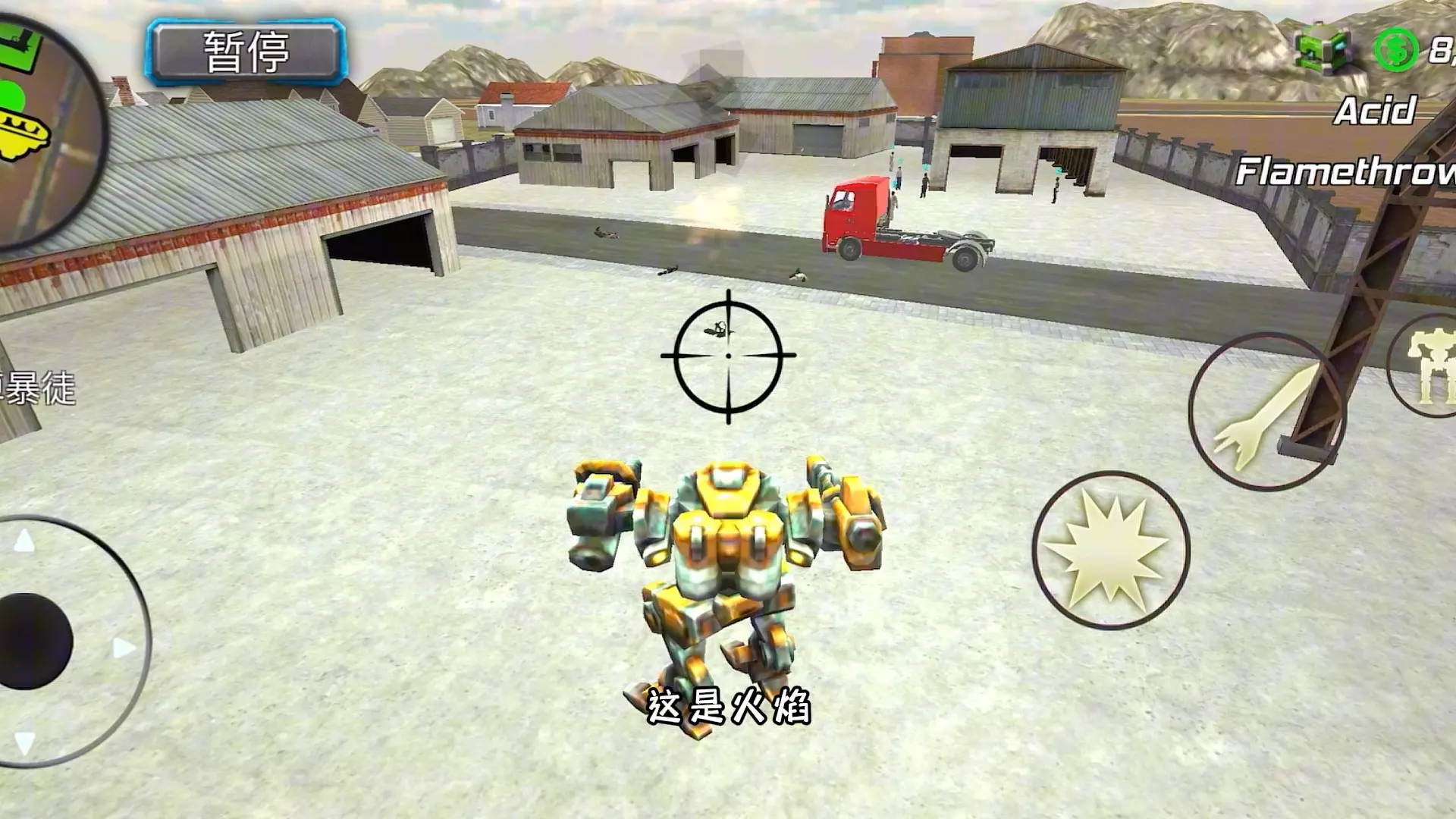 这是《绳索英雄》的游戏测试内容,玩家操控机甲使用火焰枪焚烧垃圾车,成功触发了游戏彩蛋,展示了该游戏里的趣味玩法。