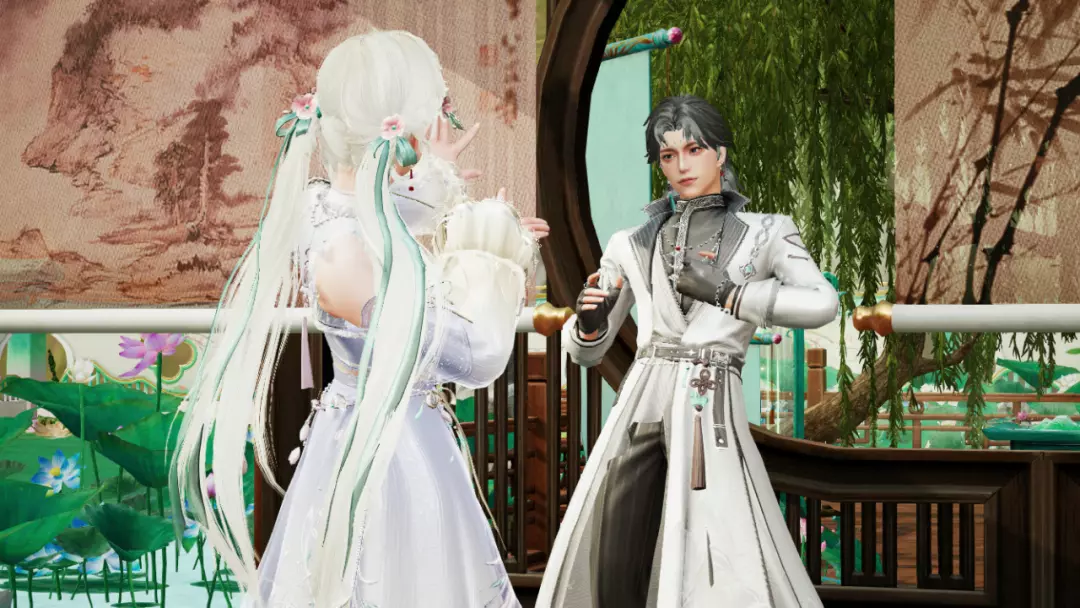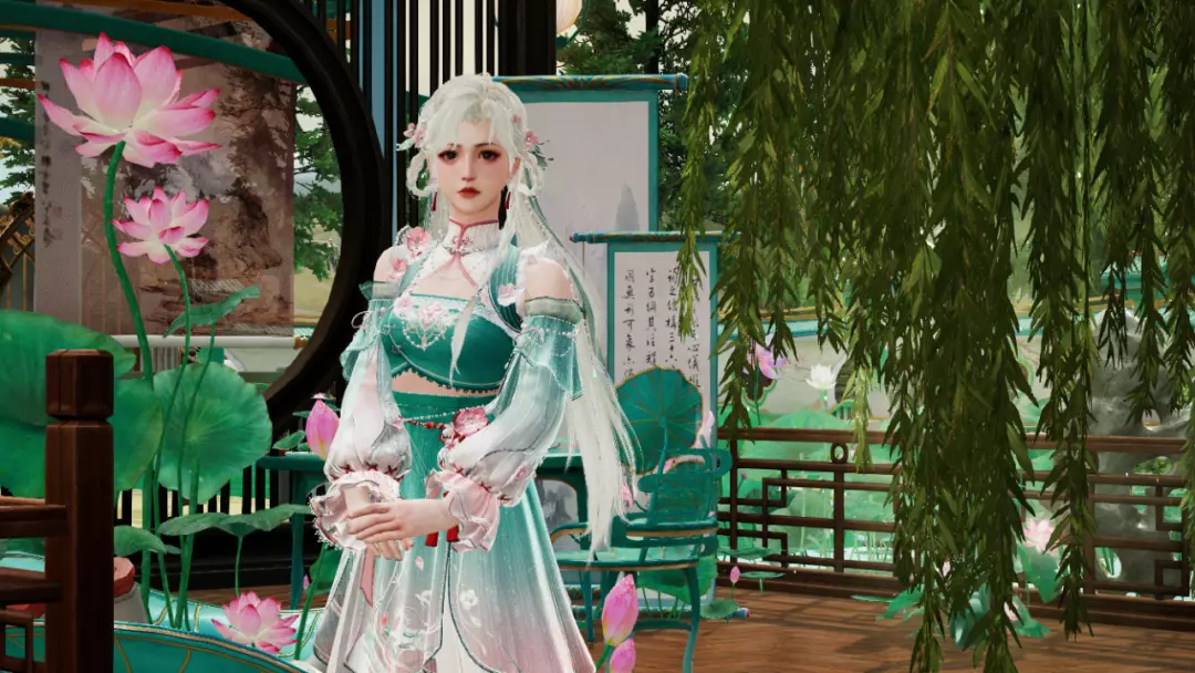 青碧渐变轻纱笼着洁白裙摆