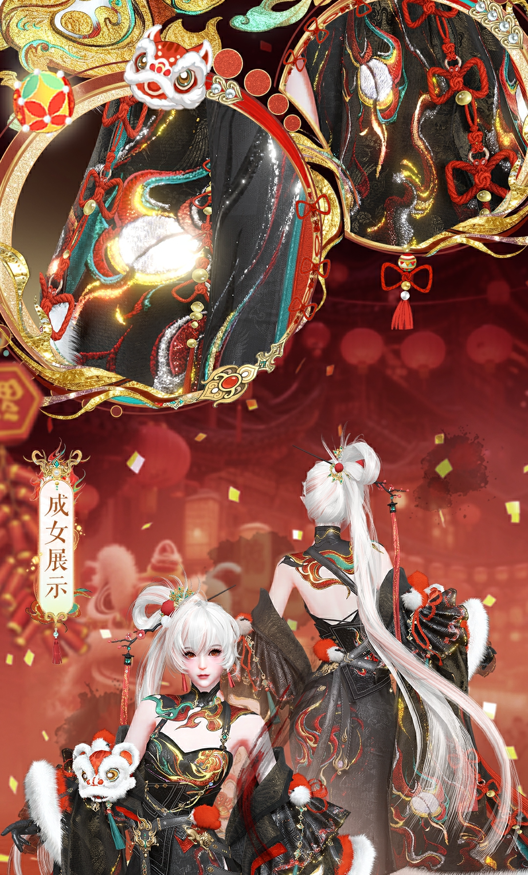 玄色旗袍利落裹身,红金交织的火焰刺绣自胸口燃至裙摆。重工打造的皮质腰封上,鎏金狮首金属饰件傲然镇守。巨大的云袖袖摆铺展,金焰赤狮图腾跃然其上,行止间似有狮吼破风!边缘饰以温暖的白色绒毛,宛如祥云环绕,步步生风。袖口幼狮欢腾嬉戏,增添了一丝灵动与福气!