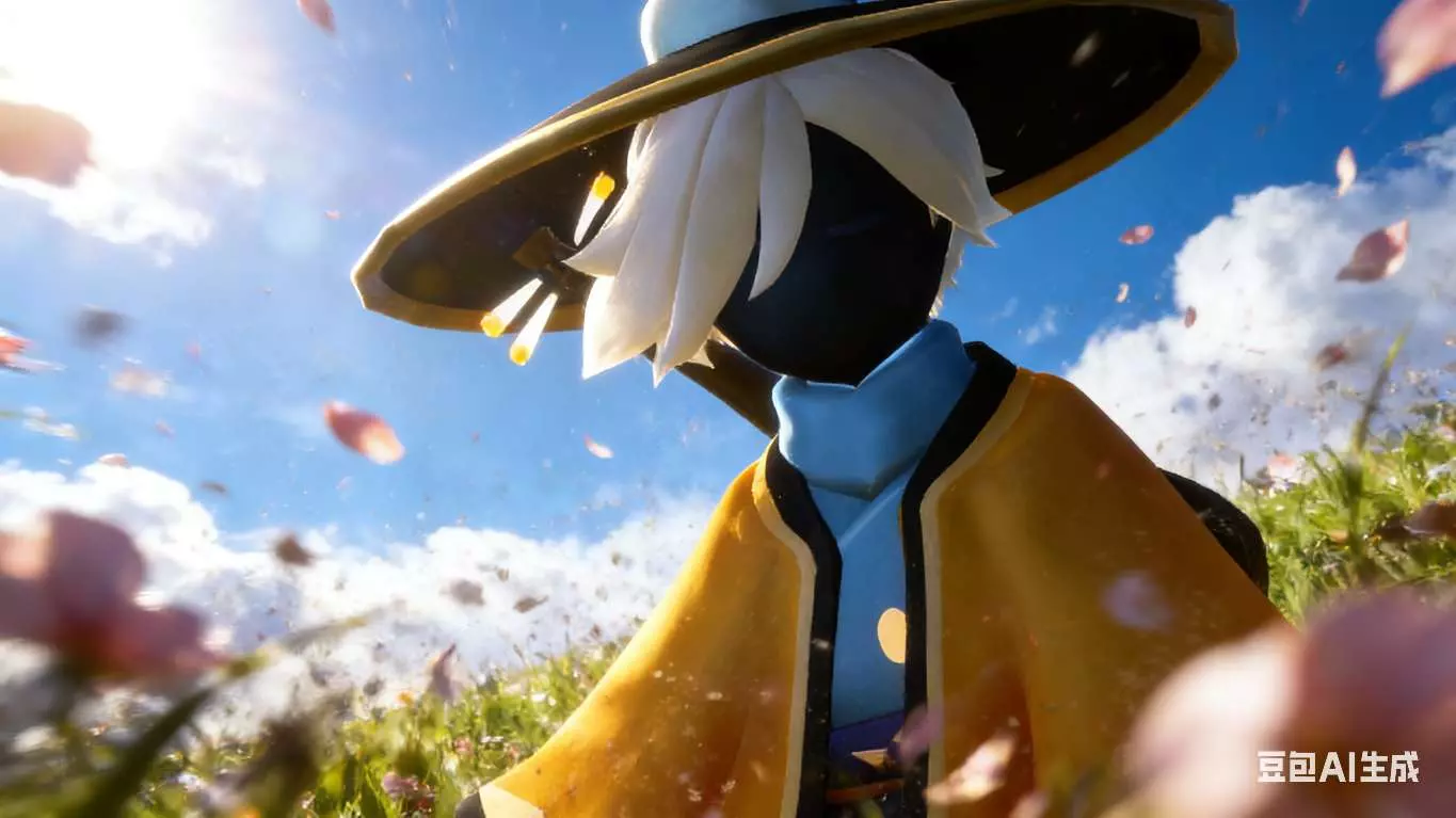 好看,帮我生成图片:游戏CG风格,极具艺术感、震撼人心,色彩丰富,暗部叠加,特写镜头,超高清。花瓣飞溅,前景花瓣虚化,动态模糊,背景动态虚化,阳光灿烂,蓝天白云,光影交错,仰拍特写镜头,突出速度感和视觉冲击力,强透视。保持人物不变,不要压缩人物!!原比例。